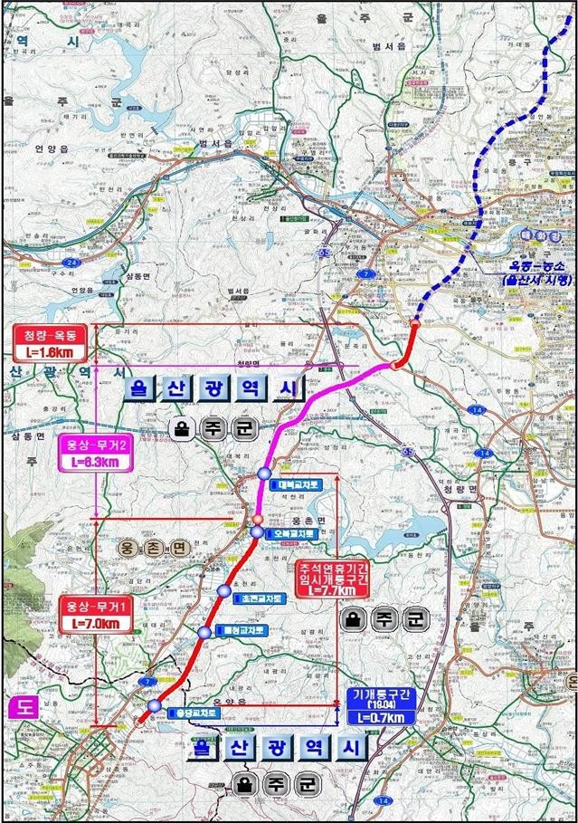 국도7호선 양산시 용당동에서 울산광역시 울주군 청량읍 문죽리까지 연결되는 신설국도는 총연장 13.3km로 10월말 울주군 대복리까지 7.7km를 먼저 개통하고 연말까지 전구간을 개통할 계획이다.