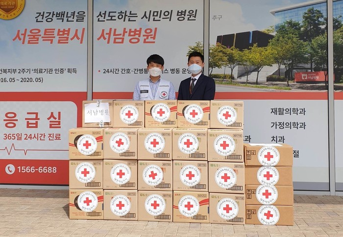 대한적십자사 서울시지사가 지난 21일 국가지정 전담병원 및 국가지정 입원치료병상 의료진들에게 마스크, 전통차, 의료용 드레싱을 지원했다. 지원 물품은 국가지정 전담병원인 서울의료원, 서남병원, 보라매병원, 국립중앙의료원, 서북병원 및 국가지정 입원치료병상인 서울대학교병원 등에 전달됐다. 사진은 관계자들이 기념촬영을 하는 모습. (사진제공=대한적십자사 서울시지사)