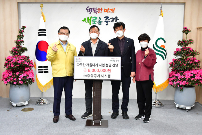 서울 중랑구는 최근 상봉2동 소재 (주)중앙공사시스템으로부터 ‘2021년 희망온돌 따뜻한 겨울나기’ 성금 800만원을 기탁받았다. 사진은 기탁식에서 류경기 구청장(왼쪽)과 송일상 대표 및 관계자들이 기념촬영을 하고 있는 모습. (사진제공=중랑구청)
