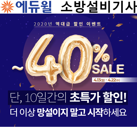 이달 13일부터 22일까지, 총 10일간 진행하는 이번 이벤트는 모든 소방설비기사 강의에 대해 40%의 할인을 적용한다.
