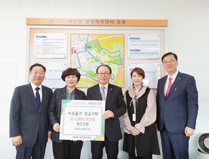 경기 김포시 양촌신협이 최근 지역내 저소득층을 위한 성금 100만원을 마산동행정복지센터에 기탁했다. 이번 성금은 사회적 거리두기로 축소된 양촌신협 제18대 이사장 취임식 예산과 임직원들의 자발적인 모금으로 마련됐다. 사진은 관계자들의 기념촬영 모습. (사진제공=김포시청)