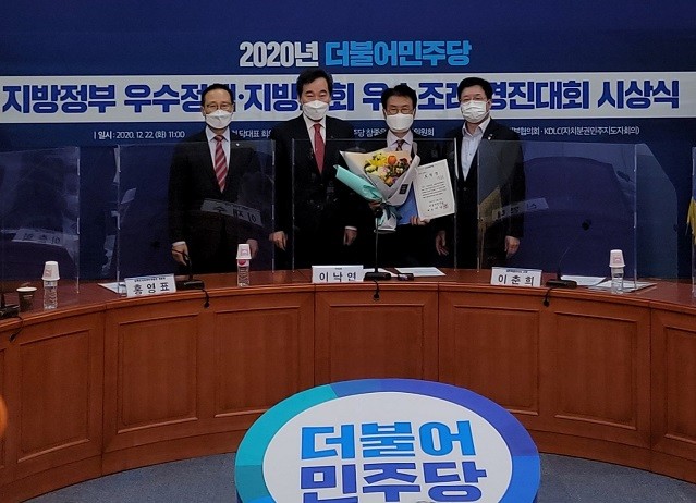 [강진=정찬남 기자] 전남 강진군(군수 이승옥)이 지난 22일 국회 더불어민주당(당대표:이낙연) 대표실에서 ‘2020 더불어민주당 지방정부 우수정책 경진대회’우수상을 수상했다고 밝혔다.