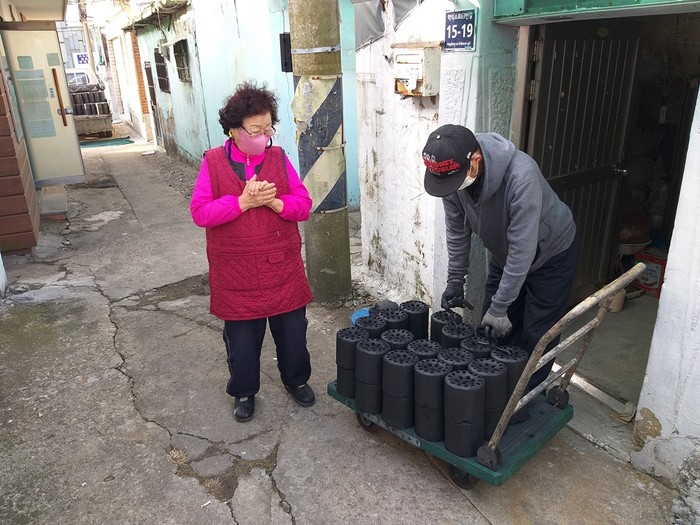 인천 미추홀구 학익2동 행정복지센터에서는 최근 미추홀구 소재 기업인 '두원계전'과 '디씨알이'에서 각각 200만원씩 총 400만원 후원금을 기탁받아, 한파취약계층을 대상으로 연탄나눔사업을 진행했다. 사진은 센터 관계자가 노인에게 연탄을 전달하고 있는 모습. (사진제공=미추홀구청)