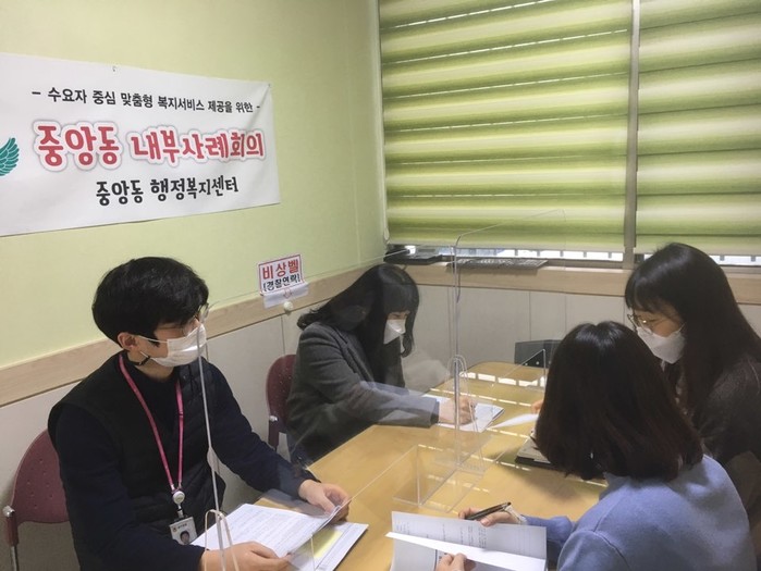 경기 동두천시 중앙동 행정복지센터는 12일 신규로 발굴된 위기가구 지원을 위한 제1회 내부사례회의를 개최했다. 이날 회의에서는 코로나19로 생계위기에 놓인 2가구가 안건으로 상정됐으며, 가구당 위기 요소를 검토하고 사례관리 대상자 선정 여부를 논의했다. 사진은 회의가 진행되고 있는 모습. (사진제공=동두천시청)