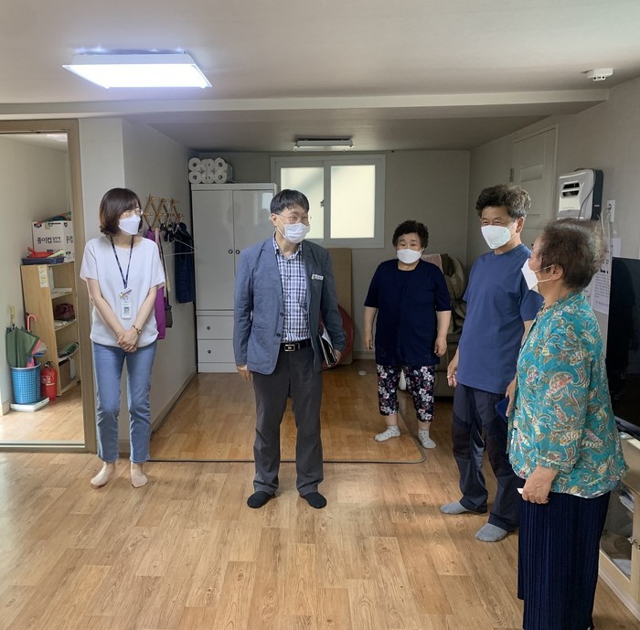경기 구리시 교문1동은 6일 ‘쾌적한 경로당 만들기’를 위해 경로당 14곳을 방문해 방역수칙 준수 당부 및 안전한 무더위쉼터 운영을 위한 주요 사항을 전달했다. 사진은 동 관계자가 경로당을 방문해 노인들과 대화를 나누고 있는 모습. (사진제공=구리시청)