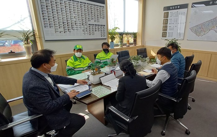 경기 수원시 장안구 영화동은 지난 5일 쓰레기와 관련된 주민 불편사항을 해결하기 위해 청소업체 (주)백양티엔에스와 간담회를 진행했다. 이번 간담회를 통해 업체는 청소 인력과 차량을 추가로 투입해 운영하며, 골목길에 있는 재활용품 수거 그물망 100여개를 없애고 투명비닐을 사용해 효율적으로 수거하기로 했다. 사진은 참여자들이 회의하는 모습. (사진제공=장안구청)