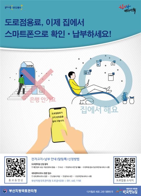 부산지방국토관리청(청장 구헌상)은 비대면 시대에 발맞추어, 도로점용 피허가자의 편안한 도로점용료 납부를 위해 스마트폰을 통해 고지 내용을 안내 받아 확인하고 납부하는 서비스를 오는 4월부터 시작한다고 밝혔다.