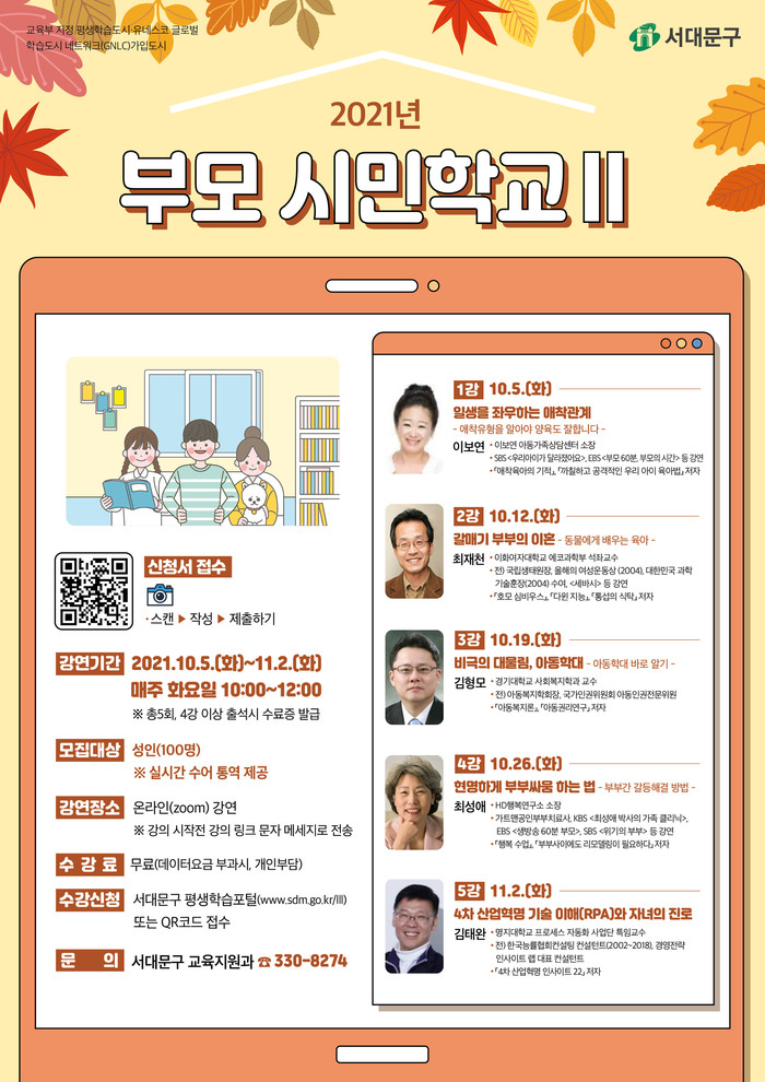 먼저, 부모 시민학교는 오는 10월5일부터 11월2일까지 매주 화요일 오전 10시~낮 12시에 진행된다.