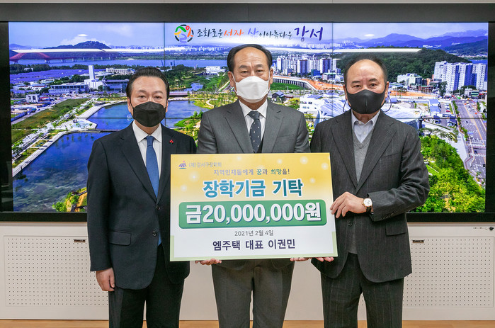 서울 강서구는 최근 엠주택으로부터 지역 인재 육성을 위한 장학기금 2000만원을 전달받았다. 기탁금은 (재)강서구장학회를 통해 기초생활수급자 등 저소득층 아이들의 학업 지원을 위해 쓰인다. 사진은 전달식에서 노현송 구청장(왼쪽)과 관계자들이 기념촬영을 하는 모습. (사진제공=강서구청)