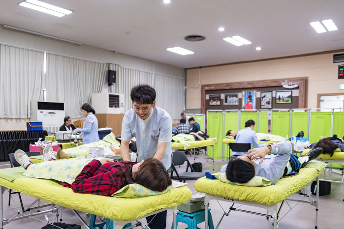 서울 광진구가 6일 구청 대강당에서 구청 직원 및 주민을 대상으로 ‘광진가족 사랑의 헌혈’ 행사를 진행했다. 이날 구청 직원 및 주민 120여명이 자발적으로 헌혈에 참여해 생명나눔을 실천했다. 사진은 구청 직원들이 헌혈하고 있는 모습. (사진제공=광진구청)