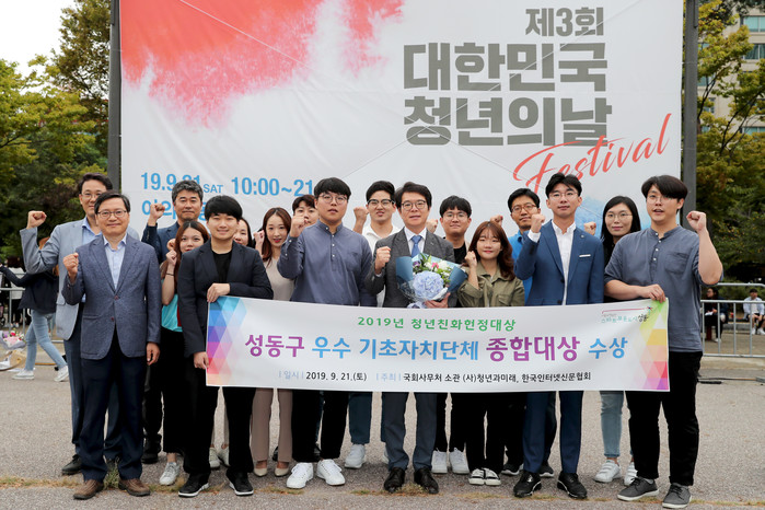 서울 성동구가 최근 국회사무처 소관 ‘사단법인 청년과 미래’에서 주최한 ‘2019년 청년친화 헌정대상’에서 우수 기초자치단체 종합대상을 받았다. 사진은 시상식에서 상을 받은 후 정원오 구청장과 청년들이 기념촬영을 하는 모습. (사진제공=성동구청)