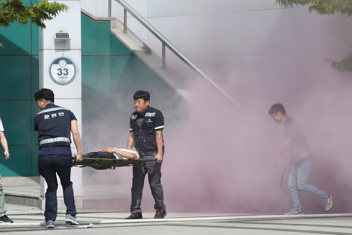 22일 경기 고양시 어울림누리에서 열린 육군 1군단 통합작전수행절차 시범교육에서 고양시설관리공단 관계자들이 부상자를 옮기는 훈련을 하고 있다.