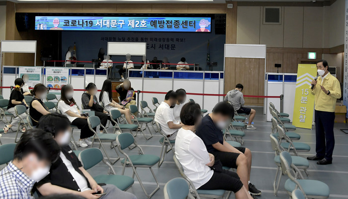 문석진 서대문구청장이 지난 26일 구청 6층 대강당에 설치된 ‘코로나19 서대문구 제2호 예방접종센터’를 찾아 운영현황을 점검했다. 이곳의 하루 최대 접종 인원은 900여명이며 평일 오전 9시~오후 5시 운영된다. 사진은 문 구청장(오른쪽) 접종 대상자들에게 유의 사항을 전하고 있는 모습. (사진제공=서대문구청)
