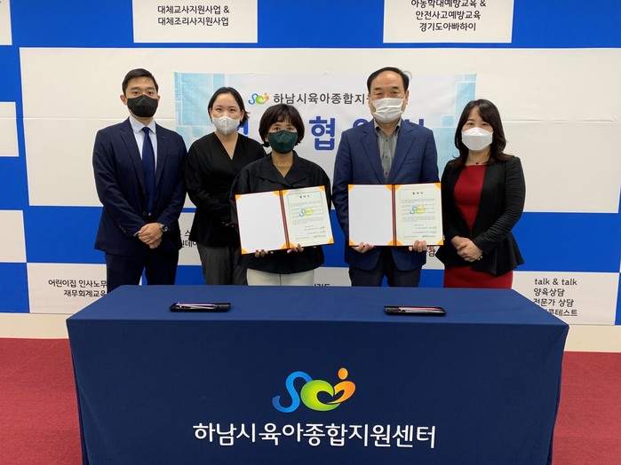 경기 하남시육아종합지원센터와 하남시사회복지협의회는 7일 업무협약을 맺고 양질의 보육환경 조성 및 지역복지 활성화에 협력하기로 했다. 협약을 통해 두 기관은 양질의 양육환경 조성 및 지역복지 활성화 등에 협력할 계획이다. 사진은 협약식에서 관계자들이 기념촬영을 하는 모습. (사진제공=하남시청)
