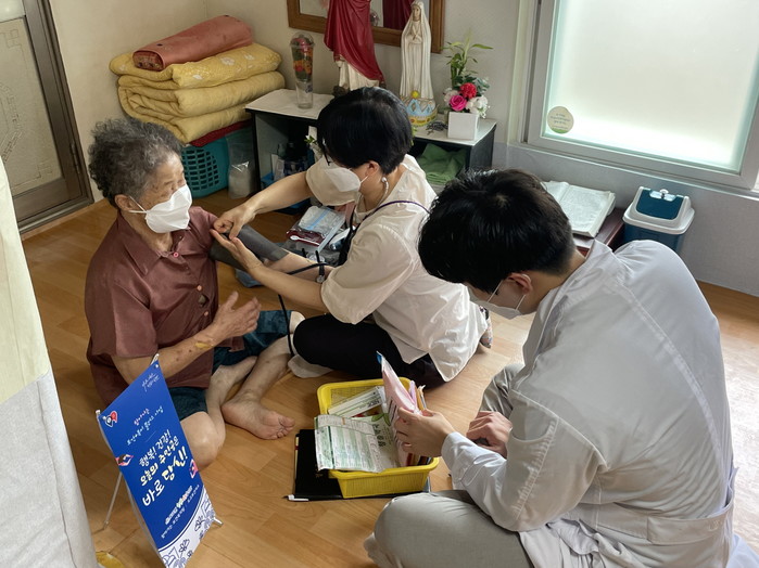 충남 아산시 도고면 행복키움추진단과 도고보건지소가 최근 저소득 노인을 위해 한방 의료 건강상담 등을 실시하고 건강꾸러미를 지원하는 맞춤형 한방의료 건강상담과 생일 잔치를 마련했다. 사진은 보건지소에서 대상 가구를 방문해 혈압을 재고 있는 모습. (사진제공=아산시청)
