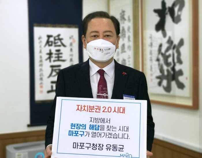 유동균 서울 마포구청장이 지난 12일 ‘자치분권 기대해 챌린지’에 동참했다. 이 챌린지는 자치분권 실현에 대한 소망을 공유하자는 취지로 대통령 직속 자치분권위원회에서 시작돼 그 릴레이를 이어오고 있다. 사진은 유 구청장이 자치분권 기대해 챌린지에 참여하고 있는 모습. (사진제공=마포구청)