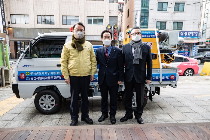 서울 광진구 자양1동 새마을지도자협의회는 최근 광진제일새마을금고로부터 지역사회 안전을 위한 방역차량과 방역기를 기증받았다. 이번 기증을 통해 지역 곳곳을 신속하게 방역할 수 있게 됐다. 사진은 기증식에서 김선갑 구청장(왼쪽)과 관계자들이 기념촬영을 하는 모습. (사진제공=광진구청)