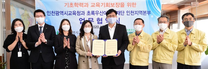 인천시교육청이 6일 초록우산어린이재단과 기초학력 지원 및 교육기회 보장을 위한 업무협약을 체결했다. 협약에 따라 양 기관은 협력사업을 통해 지역내 초등학교 저학년 '읽기 및 연산 유창성' 향상을 위해 상호 지원한다. 사진은 협약 체결 후 도성훈 교육감(오른쪽 네 번째)과 관계자들이 기념촬영을 하는 모습. (사진제공=인천시교육청)