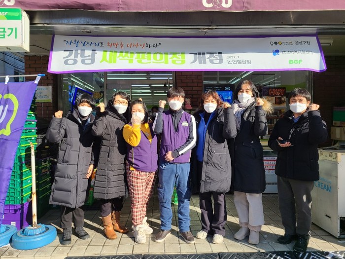 서울 강남구가 취약계층 일자리 창출을 위해 BGF리테일과 연계한 ‘CU새싹가게 논현힐탑점’(학동로30길 39)을 최근 문 열었다. 강남 1호 새싹가게는 강남지역자활센터 소속 10명이 2인 1조가 돼 8시간씩 3교대로 주 5일(40시간) 근무한다. 사진은 강남 새싹편의점 관계자들이 개점을 축하하며 기념촬영을 하고 있는 모습. (사진제공=강남구청)
