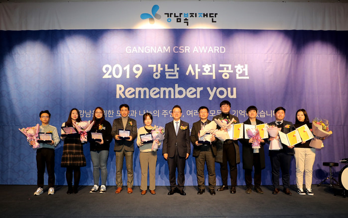 서울 강남구는 17일 오후 4시 청담동 프리마호텔에서 ‘2019 강남 사회공헌 Remember you’ 우수사회공헌대상 시상식을 열고 지역사회 복지 증진에 기여한 우수사회공헌기업 10곳을 선정해 시상했다. 사진은 시상 후 시상자들과 함께 기념촬영을 하고 있는 정순균 구청장(가운데)의 모습. (사진제공=강남구청)