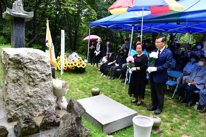 류경기 서울 중랑구청장이 23일 소파 방정환 선생 서거 89주기를 맞아 망우리공원을 찾아 방정환 선생 묘역에서 참배했다. 사진은 류 구청장(오른쪽)이 추모식에서 헌화하고 있는 모습. (사진제공=중랑구청)