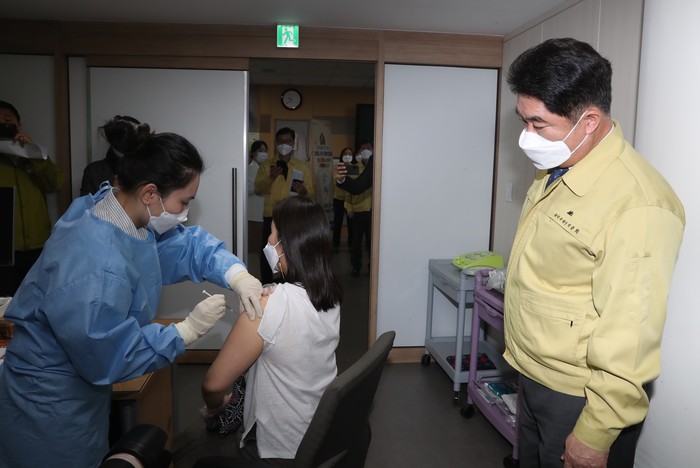 서울 관악구가 26일 지역내 만 65세 미만 요양병원·요양시설 등의 입소자 및 종사자 662명을 대상으로 코로나19 예방접종을 시작했다. 사진은 이날 박준희 구청장(오른쪽)이 백신 접종을 받고 있는 대상자를 확인하고 있는 모습. (사진제공=관악구청)