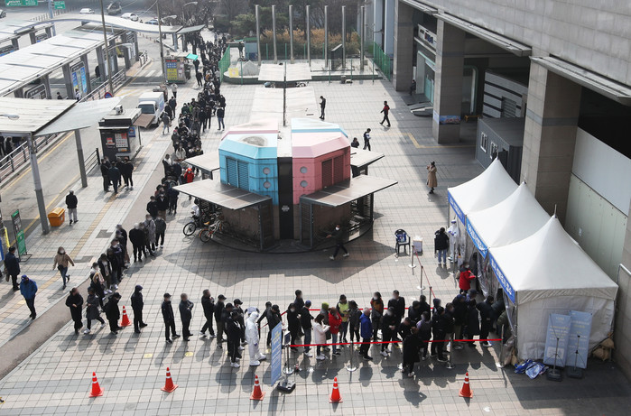 14일 오전 경기도 수원역 광장에 설치된 코로나19 임시선별진료소에 시민들과 경기도 내 외국인 근로자 코로나19 전수검사 행정명령에 따라 검사를 받으러 온 외국인 근로자들이 길게 줄을 서 있다.