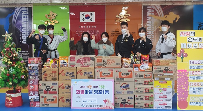 경기 수원시 영통구 망포1동 행정복지센터는 14일 충효태권도합기도장으로부터 라면 1042개를 전달받았다. 전달한 후원물품은 도장내 사랑의 온도계를 설치하고 ‘사랑의 라면트리 만들기’를 진행해 원생들이 십시일반 모은 것이다. 사진은 전달식에서 관계자들이 기념촬영을 하는 모습. (사진제공=영통구청)