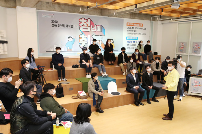 성동구가 지난 7일 2020 청년정책포럼 ‘청년에 취하다 토크콘서트’를 개최했다. 콘서트는 뮤지션 공연을 시작으로 구청장과 함께 청년들의 의견을 전달하고 심도 있는 토론으로 진행됐다. 사진은 이날 정원오 구청장(오른쪽)과 청년들이 대화를 나누고 있는 모습. (사진제공=성동구청)