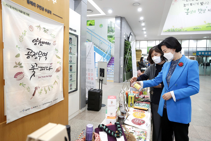 양천구는 최근 구청 1층 로비와 사회적경제지원센터의 공정무역홍보관에서 세계 공정무역의 날 기념 캠페인을 진행했다. 사진은 김수영 구청장이 공정무역 제품을 둘러보고 있는 모습. (사진제공=양천구청)