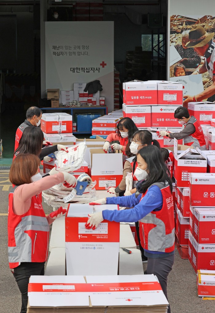 13일 서울 양천구 대한적십자사 재난안전센터에서 자원봉사자들이 코로나19 재난 대비 긴급 구호세트를 제작하고 있다.