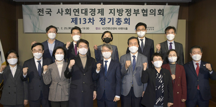 문석진 서울 서대문구청장이 25일 ‘전국 사회연대경제 지방정부협의회’ 13차 정기총회에서 제5기 회장으로 선출됐다. 사진은 정기총회에서 문석진 구청장(앞줄 오른쪽 네 번째)이 제5기 회장으로 선출된 뒤 참석자들과 함께 '파이팅'을 외치고 있는 모습. (사진제공=서대문구청)