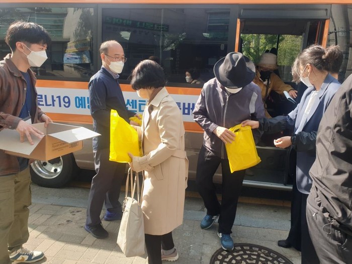 서울 용산구가 코로나19 백신을 접종한 노인들에게 KF 마스크를 인당 10장씩 배부해 호응을 얻고 있다. 사진은 최근 남영동 주민센터 직원들이 백신 접종 후 귀가하는 노인들에게 KF 마스크를 나눠주고 있는 모습. (사진제공=용산구청)