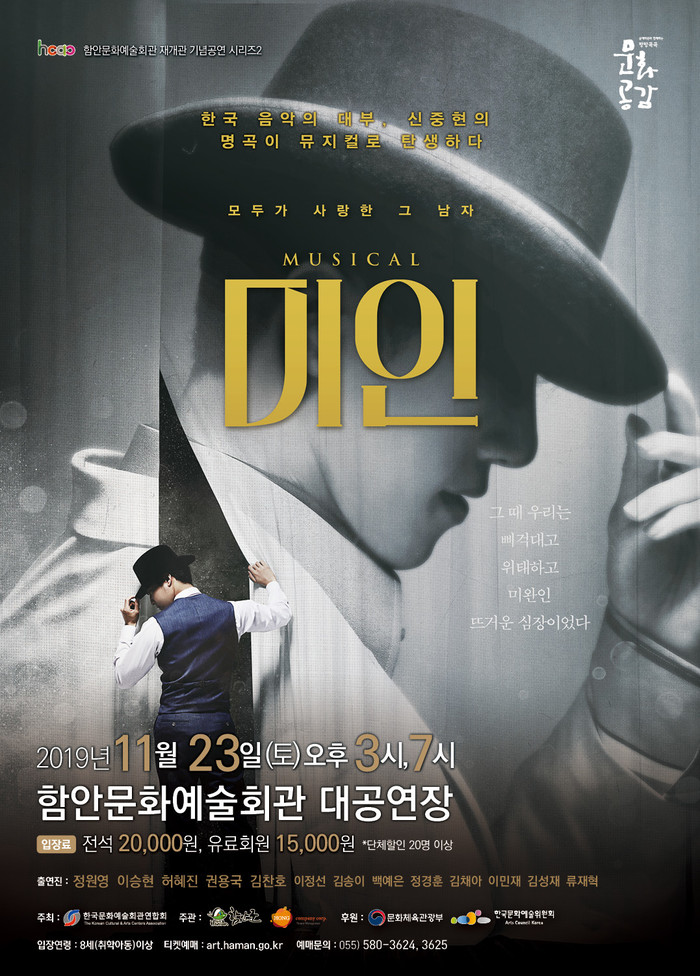 아울러 뮤지컬 ‘미인’ 공연은 한국문화예술회관연합회(회장 이승정)의 ‘문예회관과 함께하는 방방곡곡 문화공감사업’의 일환으로 마련돼 지역문화예술 성장과 문예회관의 활성화를 도모코자 우수공연의 초청경비를 지원, 객석의 30%는 문화소외계층에 배정할 계획이다.