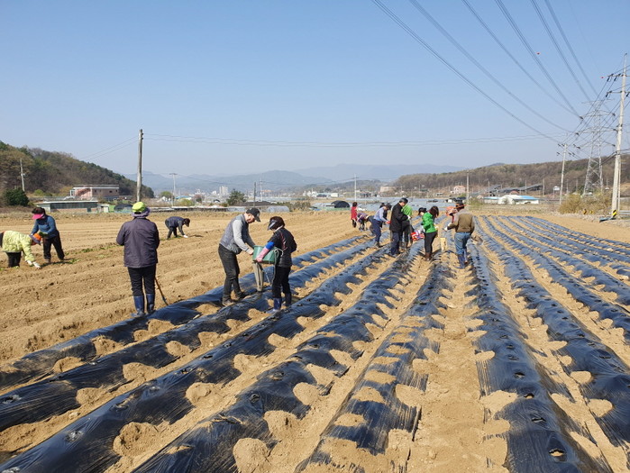 경기 양평군 개군면 지역사회보장협의체가 최근 자연리 텃밭에서 협의체 위원과 복지반장 등 30여명이 참여한 가운데 '사랑의 감자 심기' 행사를 개최했다. 이날 심은 감자는 오는 6월 수확해 지역내 취약계층 등에 전달될 예정이다. 사진은 감자를 심는 모습. (사진제공=양평군청)
