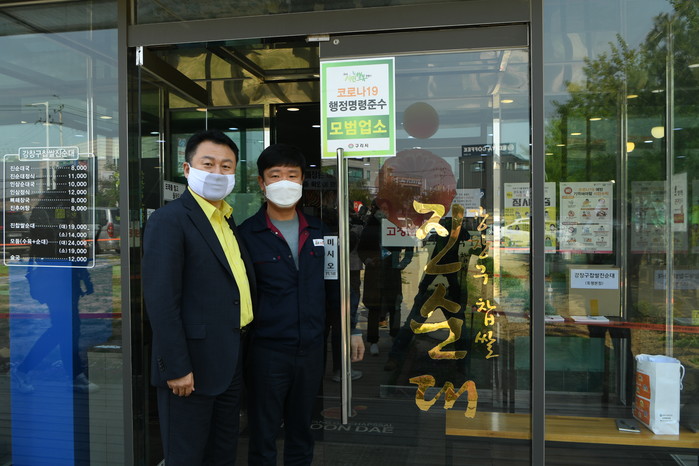 경기 구리시 재난안전대책본부는 코로나19 행정명령 준수 모범업소로 최종 선정된 업소를 대상으로 인증스티커를 부착하고 있다. 인증스티커 부착 대상 업소는 총 2042곳이다. 사진은 안승남 시장(왼쪽)이 인증스티커 부착 후 기념촬영을 하는 모습. (사진제공=구리시청)