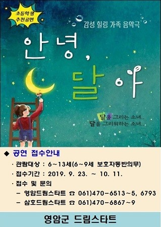 [영암=정찬남 기자] 전남 영암군(군수 전동평)에서는 10월 문화의 달을 맞이해 문화 체험의 기회가 적은 아동들에게 문화적 소외감 해소와 새로운 경험 및 폭넓은 가치관 형성에 도움을 주고자 대학로 가족뮤지컬‘안녕, 달아’공연을 계획하고 있다.