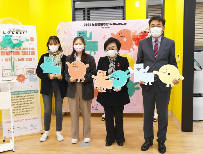 오승록 서울 노원구청장은 지난 27일 ‘2021노원청년주간행사 노랑타운 네트워크파티’에 참석했다. 이날 행사는 노원오랑 서포터즈 및 노원 청년이 모여 청년정책 공유를 위해 마련된 자리로 온라인 메타버스 게더타운으로 진행했다. 사진은 이날 오 구청장(오른쪽)이 관계자들과 기념촬영을 하는 모습. (사진제공=노원구청)