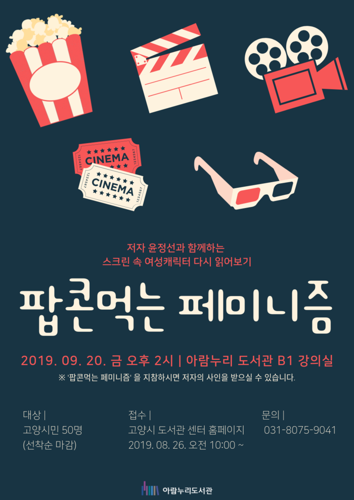 [고양=이기홍 기자] 예술 특성화 도서관인 고양시립 아람누리도서관에서는 오는 9월 20일 오후 2시부터 문화체육관광부가 주최하고 한국도서관협회가 주관하는 예술특화프로그램 ‘팝콘 먹는 페미니즘’에 대한 저자 강연이 개최된다.