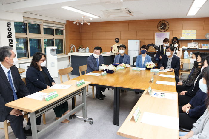 이동진 도봉구청장은 최근 월천초등학교로부터 교육환경 개선을 위한 도봉구의 지원과 노력에 대한 감사패를 전달받았다. 사진은 수상 후 이 구청장(왼쪽 가운데)이 참석자 및 관계자들과 간담회를 하는 모습. (사진제공=도봉구청)