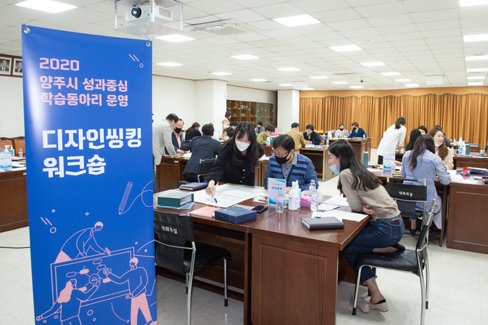 경기 양주시가 최근 시청 대회의실에서 학습동아리 디자인씽킹 1차 워크숍을 개최했다. 이날 워크숍에는 코로나19에 따른 사회적 거리 유지를 위해 11개 동아리별 3명씩 최소인원이 참석했다. 사진은 참여자들이 회의하는 모습. (사진제공=양주시청)