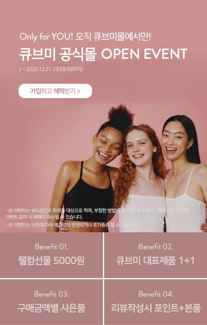 큐브미는 ‘큐브미몰’ 론칭을 기념해 오는 12월31일까지 제품 1개만 구입해도 무료 배송, 웰컴 선물 5000원, 큐브미 대표 제품 1+1, 구매 금액별 사은품, 리뷰 작성 고객에게는 아모레퍼시픽 전 브랜드에서 사용 가능한 뷰티포인트 및 큐브미 제품을 제공한다.