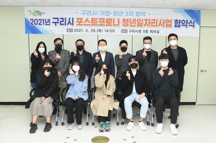 경기 구리시가 25일 시청 5층 회의실에서 '포스트 코로나 대응 청년일자리' 공모사업에 선정된 참여기업 및 청년들과 3자 협약식을 개최했다. 이날 협약식은 안승남 시장을 비롯해 최종 선발된 기업 대표 6명, 기업에 매칭된 청년 6명이 참석한 가운데 지역내 지속적인 일자리 창출과 상호 협력을 약속했다. 사진은 안 시장(뒷줄 가운데)이 관계자들과 기념촬영을 하는 모습. (사진제공=구리시청)