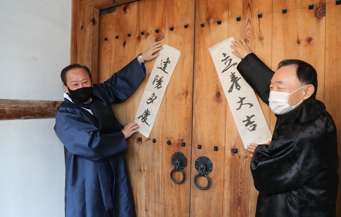 유동균 서울 마포구청장과 최병길 마포문화원장이 3일 광흥당 대문에 신축년 첫 절기인 입춘을 맞아 ‘입춘대길 건양다경’이라고 적힌 입춘축을 붙였다. 사진은 유 구청장(왼쪽)이 최 원장과 광흥당 대문에 입춘축을 붙이고 있는 모습. (사진제공=마포구청)