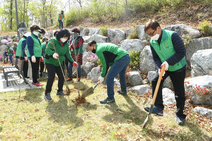경기 구리시는 22일 새마을운동 제창 50주년을 맞이해 갈매동 태극기동산에 나라사랑의 마음을 담은 무궁화 470주를 식재하고 나라사랑 상징 공간으로 가꿔 나가기로 했다. 사진은 시 관계자들이 식재 전 땅을 고르는 모습. (사진제공=구치시청)