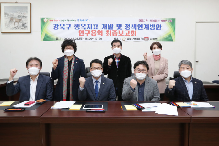 [시민일보 = 홍덕표 기자] 서울 강북구의회(의장 이용균) '마음치유·행복증진 정책연구회'는 최근 구의회 3층 의원회의실에서 ‘행복지표 개발·정책연계 방안 연구용역 최종보고회를 개최했다.