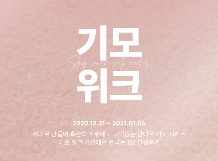 [시민일보 = 홍덕표 기자] 애슬레저 리딩 브랜드 안다르가 21일부터 오는 2021년 1월4일까지 갑작스럽게 찾아온 한파에 대비할 수 있는 '안다르 기모위크' 특별 프로모션을 진행한다.