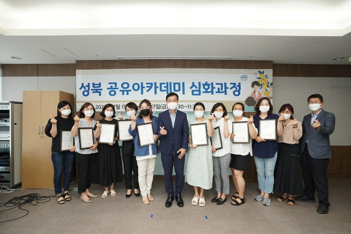 서울 성북구가 최근 구청에서 '2020 성북구 공유 아카데미 심화과정' 수료식을 개최했다. 이번 과정은 2017·2018년 공유 아카데미를 수료한 14명의 공유활동가들을 대상으로 역량을 강화하기 위해 운영됐다. 사진은 이승로 구청장(왼쪽 여섯 번째)과 수료생들의 기념촬영 모습. (사진제공=성북구청)