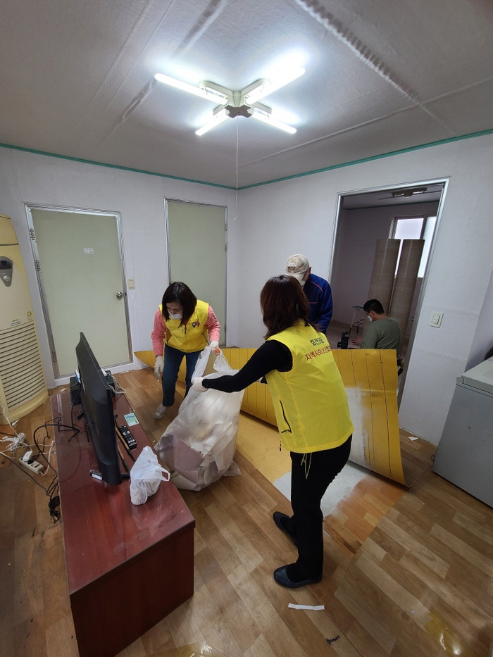 경기 양주시 회천3동 지역사회보장협의체가 10일 지역내 열악한 주거환경에 놓인 저소득 노인가정을 방문해 주거환경 개선사업을 추진했다. 사진은 이날 협의체 위원이 노후된 벽지와 장판을 교체하고 방치된 생활쓰레기를 수거하고 있는 모습. (사진제공=양주시청)