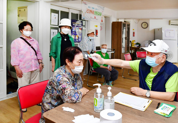 서울 중랑구가 10일 코로나19로 휴관 중이었던 경로당 127곳의 운영을 재개했다. 사진은 중랑구 신내11단지 아파트 경로당에 방문한 노인이 발열체크를 하고 있는 모습. (사진제공=중랑구청)